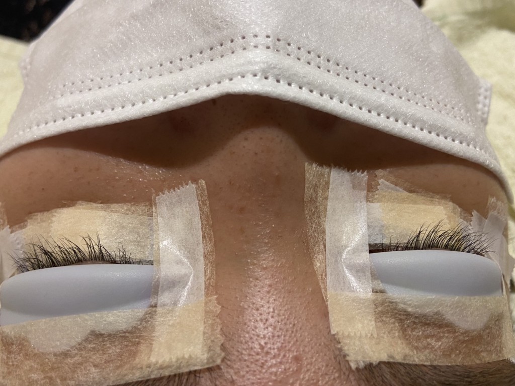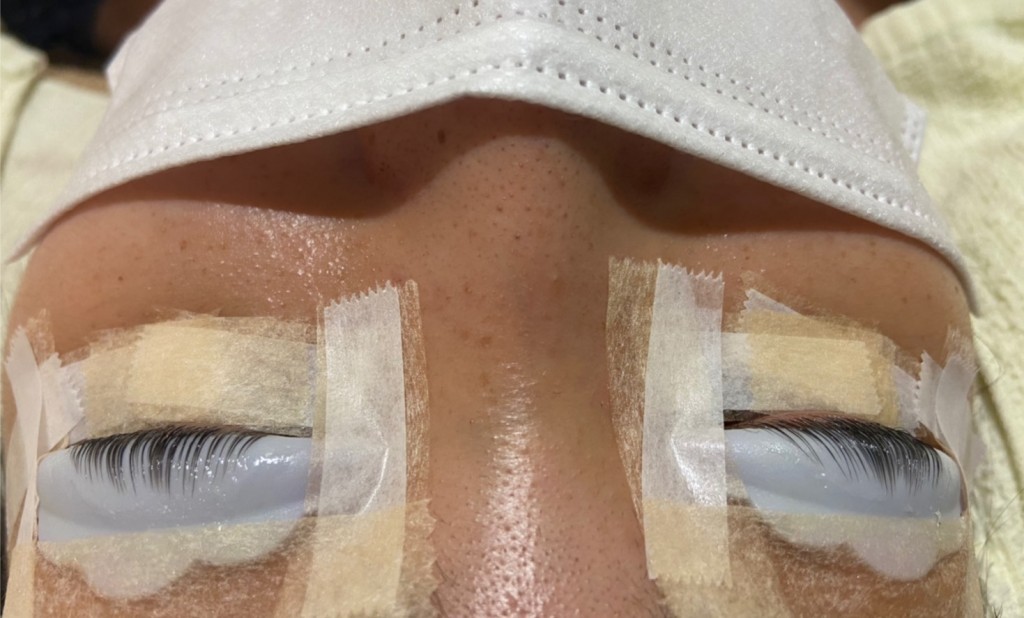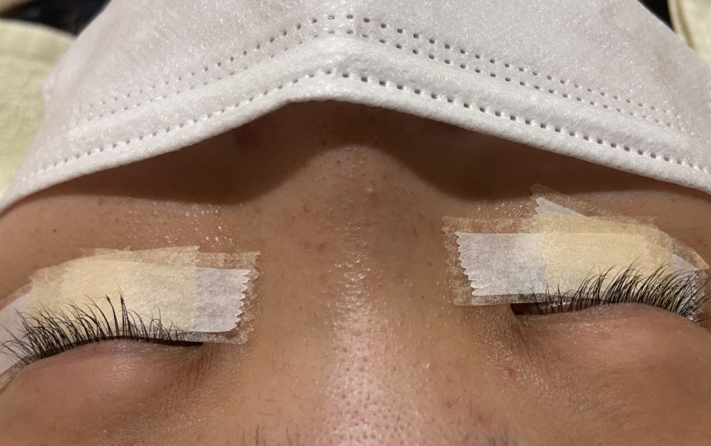 上まつ毛と下まつ毛が絡まらないように、下まつ毛をテープで保護します